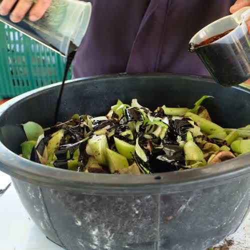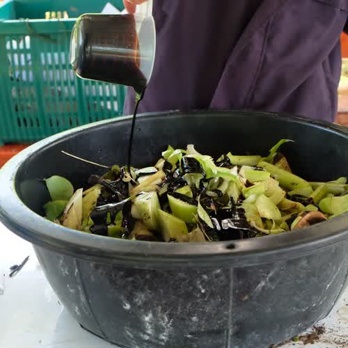 "ใส่กากน้ำตาลไปที่ต้นกล้วยที่หั่นไว้".
