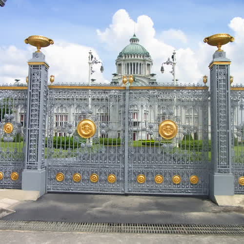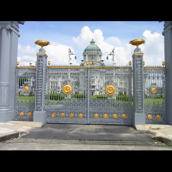 | คำอธิบาย : ประตูทวยเทพสโมสร คือประตูด้านหน้าพระที่นั่งอนันตสมาคม เป็นศิลปะสถาปัตยกรรมอิตาเลียน ที่มีความงดงามทั้งลวดลายของเสาปูน ลวดลายรั้วเหล็ก ปูนปั้นเด็กเหนือเสา |