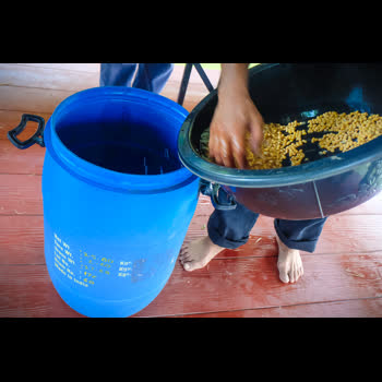 รีวิว : นำถั่วเหลืองที่แช่น้ำแล้วใส่ในถัง