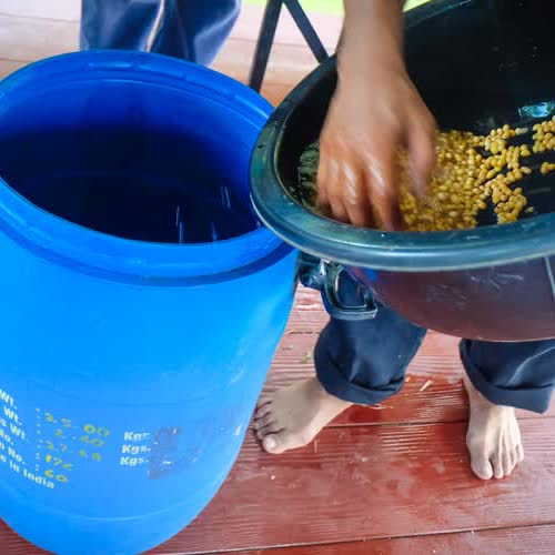 นำถั่วเหลืองที่แช่น้ำแล้วใส่ในถัง