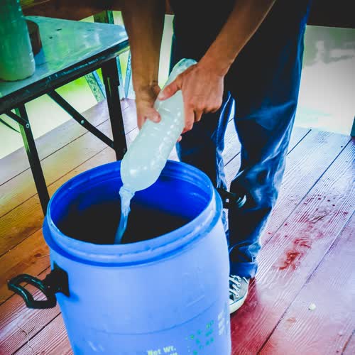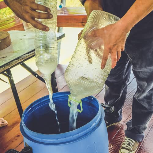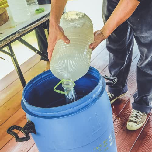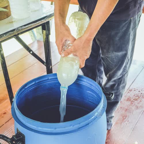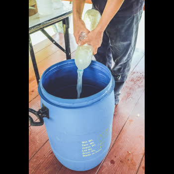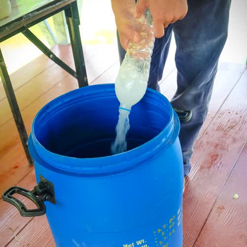 | คำอธิบาย : ใส่น้ำซาวข้าวตามลงไปในถังพลาสติก |