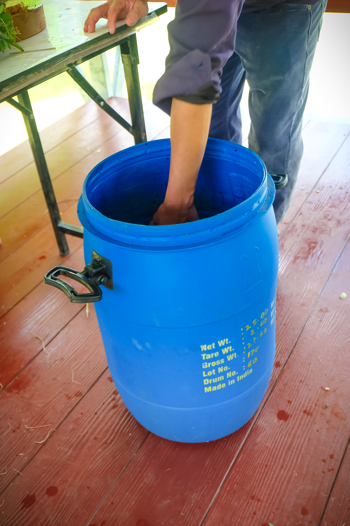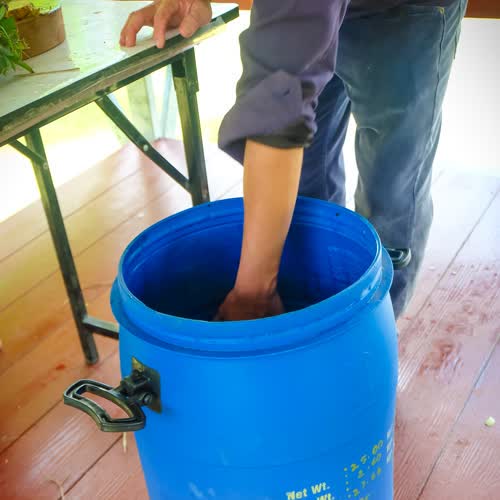 | คำอธิบาย : คนส่วนผสมที่อยู่ในถังพลาสติกให้เข้ากัน |