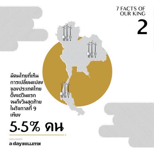 | คำอธิบาย : คนส่วนใหญ่ของประเทศไทยในปัจจุบัน เกิดในแผ่นดินของในหลวงรัชกาลที่ 9 โดยมีคนไทยเพียง 3.7 ล้านคน หรือราว 5.5% เท่านั้นที่อายุมากกว่า 70 ปี ซึ่งได้เห็นความเปลี่ยนแปลงของประเทศไทยตั้งแต่วันแรกจนถึงวันสุดท้ายของการเปลี่ยนรัชกาลที่ 9นิตยสาร a day BULLETIN ได้จัดภาพทำกราฟิก 7 เรื่องราวของ ‘พ่อแห่งแผ่นดิน’ และตลอดระยะเวลากว่า 7 ทศวรรษในการทรงงานหนักของพระองค์ ที่ได้ทรงสร้างสิ่งต่างๆ มากมายทิ้งไว้ในความทรงจำของปวงชนชาวไทย |