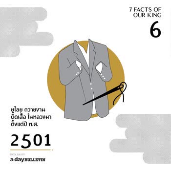 | คำอธิบาย : ร้านตัดเย็บฉลองพระองค์ของในหลวงรัชกาลที่ 9 คือร้านยูไลยเทเลอร์ ตั้งอยู่ที่ถนนศาลาแดง ตั้งแต่ปี พ.ศ. 2489 เจ้าของชื่อ ยูไลย หลุยลาภประเสริฐ ถวายงานตัดเสื้อในหลวงมาตั้งแต่ปี พ.ศ. 2501 เมื่อนายยูไลยเสียชีวิต ลูกชายคือ นายสมภพ หลุยลาภประเสริฐ มาถวายงานต่อจนถึงปัจจุบันนิตยสาร a day BULLETIN ได้จัดภาพทำกราฟิก 7 เรื่องราวของ ‘พ่อแห่งแผ่นดิน’ และตลอดระยะเวลากว่า 7 ทศวรรษในการทรงงานหนักของพระองค์ ที่ได้ทรงสร้างสิ่งต่างๆ มากมายทิ้งไว้ในความทรงจำของปวงชนชาวไทย |