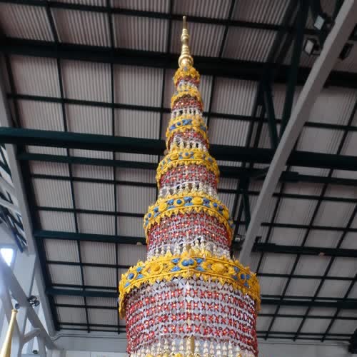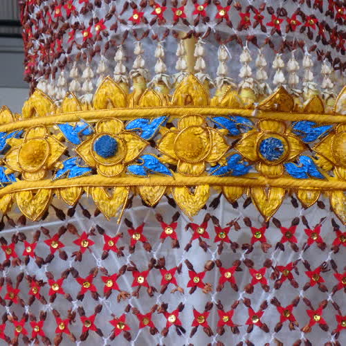 | คำอธิบาย : ฉัตรดอกไม้สด 7 ชั้น ประดับอยู่ 4 มุม พระจิตกาธานในพระเมรุมาศ พระราชพิธีถวายพระเพลิงพระบรมศพ พระบาทสมเด็จพระปรมินทรมหาภูมิพลอดุลยเดช เป็นงานกรองดอกไม้โดยใช้ดอกมะลิกรอง 4 ก้าน 4 ดอก ถักตาข่าย ประดับด้วยดอกเข็มแดงประดับเลื่อมทอง อุบะ ใช้ดอกจำปาประดิษฐ์ โดยใช้ดอกกล้วยไม้สีขาวมาผ่านขั้นตอนการดูดสีเหลืองจำปา ปัจจุบันจัดแสดงอยูที่ โรงราชรถ พิพิธภัณฑสถานแห่งชาติพระนคร |