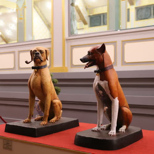 "ประติมากรรมสุนัขทรงเลี้ยง คุณโจโฉ และ คุณทองแดง".