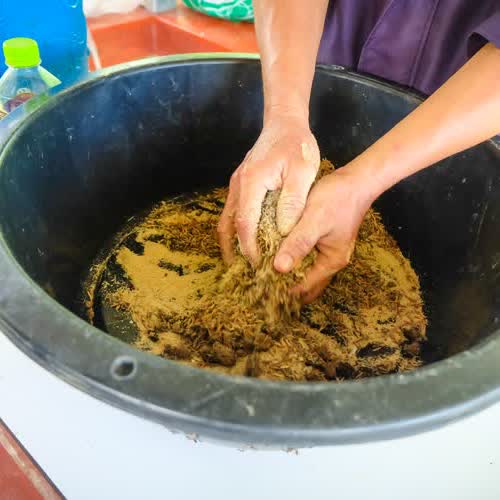 "การทำส่วนผสมแบบแห้งของโบกาฉิจากมูลสัตว์".
