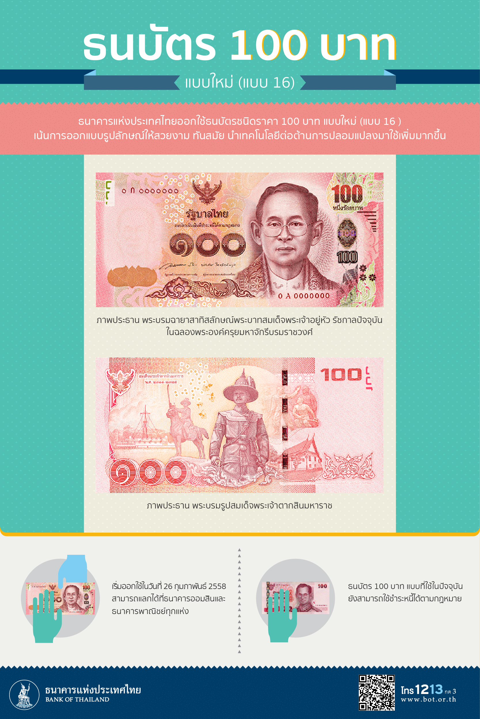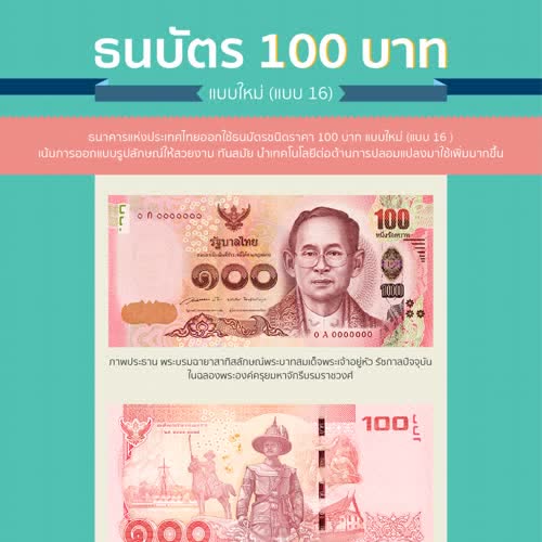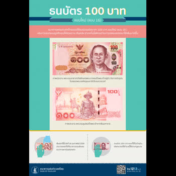 ธนบัตร 100 บาท (แบบ 16) รูปที่ 1 ได้รับใบอนุญาตภายใต้ ให้เผยแพร่-โดยต้องระบุที่มาแต่ห้ามดัดแปลงและห้ามใช้เพื่อการค้า 3.0 Thailand.