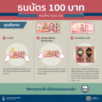 ธนบัตร 100 บาท (แบบ 16) รูปที่ 3 ได้รับใบอนุญาตภายใต้ ให้เผยแพร่-โดยต้องระบุที่มาแต่ห้ามดัดแปลงและห้ามใช้เพื่อการค้า 3.0 Thailand.