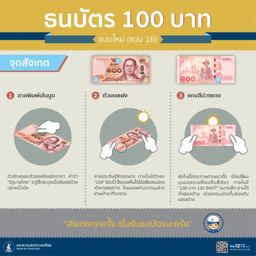 ธนบัตร 100 บาท (แบบ 16) รูปที่ 4 ได้รับใบอนุญาตภายใต้ ให้เผยแพร่-โดยต้องระบุที่มาแต่ห้ามดัดแปลงและห้ามใช้เพื่อการค้า 3.0 Thailand.