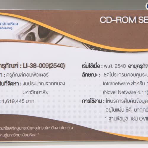 | คำอธิบาย : รหัสครุภัณฑ์ : LI-38-009(2540) เริ่มใช้เมื่อ : พ.ศ.2540 อายุครุภัณฑ์ : 20 ปี ประเภท : ครุภัณฑ์คอมพิวเตอร์ แหล่งเงินที่จัดหา : งบประมาณจากทบวงมหาวิทยาลัย ราคา : 1,619,445 บาท ลักษณะ : ชุดโปรแกรมควบคุม ระบบเครือข่าย intranetware สำหรับ 100 users (Novel Netware 4.11) การใช้งาน : ใช้บริการสืบค้นข้อมูลที่บรรจุอยู่ในแผ่นซีดี มากกว่าคราวละ 1 ฐานข้อมูล เช่น OVID ภาพ : มนตรี เล้าหะชัย |