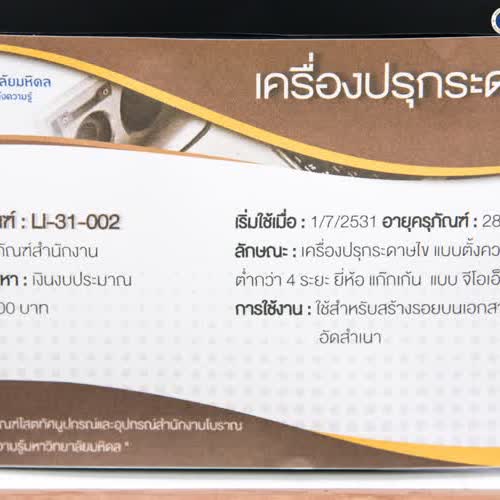 | คำอธิบาย : รหัสครุภัณฑ์ : LI-31-002 เริ่มใช้เมื่อ : 1/7/2531 อายุครุภัณฑ์ : 28 ปี ประเภท : ครุภัณฑ์สำนักงาน แหล่งเงินที่จัดหา : เงินงบประมาณ ราคา : 42,500 บาท ลักษณะ : เครื่องปรุกระดาษไข แบบตั้งความเร็วได้ไม่ต่ำกว่า 4 ระยะ ยี่ห้อ แก๊กเก้น แบบ จีโอเอ็ม 609 การใช้งาน : ใช้สำหรับสร้างรอยบนเอกสารเพื่อนำไปอัดสำเนา ภาพ : มนตรี เล้าหะชัย |