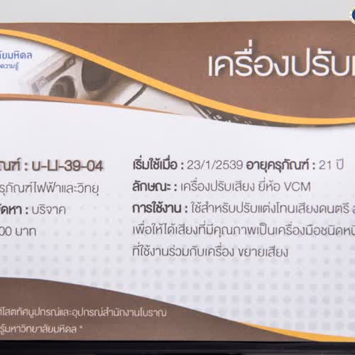 | คำอธิบาย : รหัสครุภัณฑ์ : u-LI-34-04 เริ่มใช้เมื่อ : 23/1/2539 อายุครุภัณฑ์ : 21 ปี ประเภท : ครุภัณฑ์ไฟฟ้าและวิทยุ แหล่งเงินที่จัดหา : บริจาค ราคา : 2,200 บาท ลักษณะ : เครื่องปรับเสียง ยี่ห้อ VCM การใช้งาน : ใช้สำหรับต่อเนื่องกับเรื่องฉายวีดีโอหรือกล้องถ่ายวีดีโอ เพื่อดูสัญญาณและเสียง ภาพ : มนตรี เล้าหะชัย |
