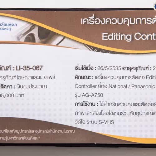 | คำอธิบาย : รหัสครุภัณฑ์ : LI-35-067 เริ่มใช้เมื่อ : 26/5/2535 อายุครุภัณฑ์ : 24 ปี ประเภท : ครุภัณฑ์โฆษณาและเผยแพร่ แหล่งเงินที่จัดหา : เงินงบประมาณ ราคา : 595,000 บาท ลักษณะ : เครื่องควบคุมการตัดต่อ (Editing Controller) ยี่ห้อ National/Panasonic รุ่น AG-A750 การใช้งาน : ใช้สำหรับควบคุมและตัดต่อสัญญาณภาพและเสียงโดยใช้งานร่วมกับอุปกรณ์ตัดต่อวิดีโอ ระบบ S-VHS ภาพ : มนตรี เล้าหะชัย |