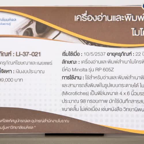 | คำอธิบาย : รหัสครุภัณฑ์ : LI-37-021 เริ่มใช้เมื่อ : 10/5/2537 อายุครุภัณฑ์ : 22 ปี ประเภท : ครุภัณฑ์โฆษณาและเผยแพร่ แหล่งเงินที่จัดหา : เงินงบประมาณ ราคา : 299,000 บาท ลักษณะ : เครื่องอ่านและพิมพ์สำเนาไมโครฟิช ยี่ห้อ Minolta รุ่น RP 605Z การใช้งาน : ใช้สำหรับอ่านและพิมพ์สำเนาไมโครฟิช และสามารถสั่งพิมพ์ในรูปแบบกระดาษได้ ไมโครฟิช (Microfiches) เป็นฟิล์มขนาด 4x6 นิ้วบรรจุภาพประมาณ 98 กรอบภาพ มักใช้บันทึกสารสนเทศที่มีขนาดสั้น ไม่ต่อเนื่อง เช่น หนังสือ วิทยานิพนธ์ เป็นต้น ภาพ : มนตรี เล้าหะชัย |