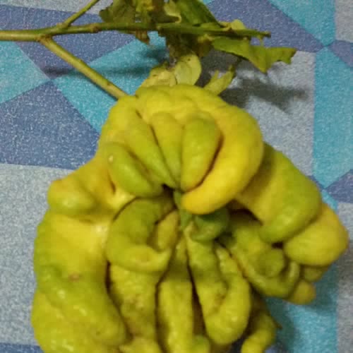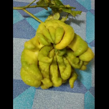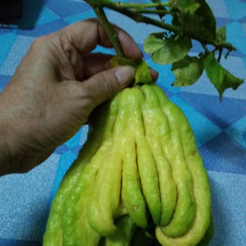 | คำอธิบาย : ผลส้มโอมือ ลักษณะของผลเป็นรูปทรงรีขนาดใหญ่ ปลายผลแยกออกเป็นแฉกงอคล้ายนิ้วมือหรือคล้ายหนวดปลาหมึก จึงเรียกว่า “ส้มมือ” ผลมีขนาดยาวประมาณ 10-25 เซนติเมตร โคนผลเรียว ผิวผลขรุขระเป็นมัน ผลอ่อนเป็นสีเขียว เมื่อสุกแล้วจะเปลี่ยนเป็นสีเหลืองอมส้ม มีกลิ่นหอม ไม่มีเนื้อผลและเมล็ด |