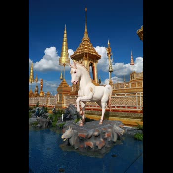 | คำอธิบาย : สัตว์มงคล ๔ ทิศ ประกอบพระเมรุมาศ งานพระราชพิธีถวายพระเพลิงพระบรมศพ พระบาทสมเด็จพระปรมินทรมหาภูมิพลอดุลยเดช บรมนาถบพิตร ตั้งอยู่บนลานอุตราวรรต บนแท่นรูปหัวสัตว์มงคลที่กำลังพ่นน้ำลงสู่สระอโนดาตเบื้องล่าง ข้างบันไดนาค ๑ เศียร ทั้ง ๔ ทิศ ที่ขึ้นสู่ฐานชาลาชั้นที่ ๑ ของพระเมรุมาศ ทิศละ ๑ คู่ เปรียบดั่งทางขึ้นเขาพระสุเมรุที่ล้อมรอบด้วยป่าหิมพานต์ และมีสัตว์หิมพานต์มากมาย ซึ่งอาศัยอยู่รอบสระอโนดาตทั้ง ๔ ทิศ แต่ละทิศก็จะมีสัตว์หิมพานต์แต่ละประเภทอาศัยอยู่ทิศตะวันตก : ม้าอาศัยอยู่ปากแม่น้ำอัสสมุข อันเป็นถิ่นที่ม้าอาศัยอยู่จำนวนมาก |