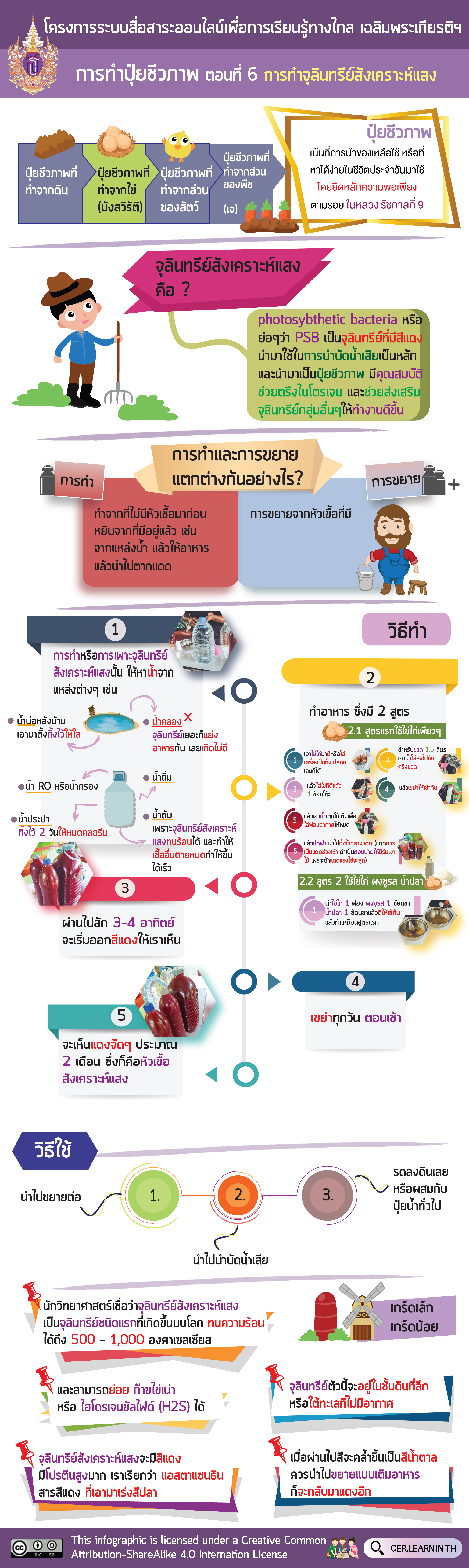 Infographic การทำปุ๋ยชีวภาพ ตอน การทำจุลินทรีย์สังเคราะห์แสง ได้รับใบอนุญาตภายใต้ ให้เผยแพร่-ดัดแปลง-โดยต้องระบุที่มา 3.0 Thailand.
