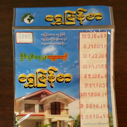 | คำอธิบาย : ล็อตเตอรี่ เป็นความหวังของผู้คนทุกชาติ เสี่ยงโชคพร้อมกับความหวังว่าจะถูกรางวัล พม่าก็มีล็อตเตอรี่เช่นเดียวกัน ภาพถ่ายจากล็อตเตอรี่ของจริงที่ได้รับจากนักศึกษาชาวพม่า |
