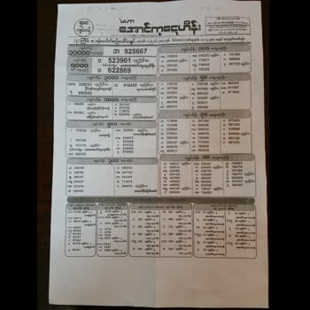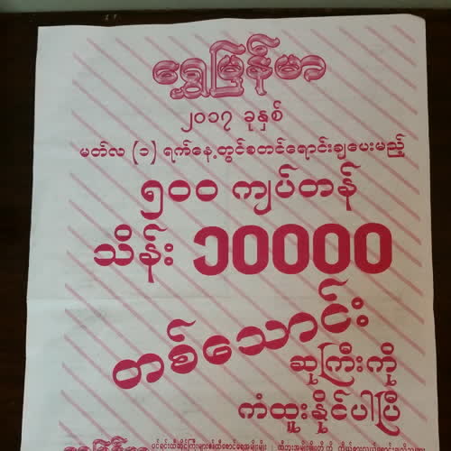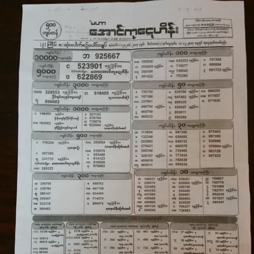 | คำอธิบาย : ล็อตเตอรี่พม่า กำหนดออกในทุกสิ้นเดือน เพียงเดือนละ 1 ครั้ง ในภาพ คือใบตรวจล็อตเตอรี่ ตามประกาศผลล็อตเตอรี่ประจำเดือน ผู้ที่ถูกรางวัลที่ 1 จะได้เงินรางวัลประมาณ 10,000,000,000 จ๊าดพม่า |