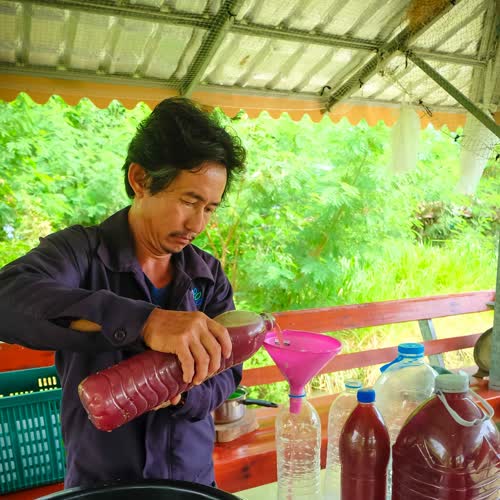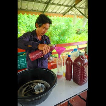 | คำอธิบาย : แล้วเอาหัวเชื้อจุลินทรีย์สังเคราะห์แสงใส่เข้าไป ใส่มากจะแดงไว น้อยจะแดงช้า |