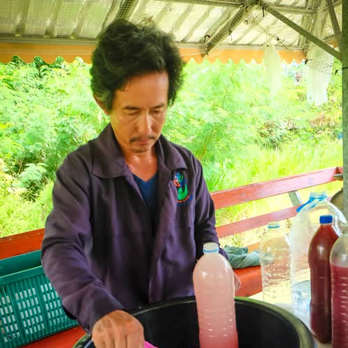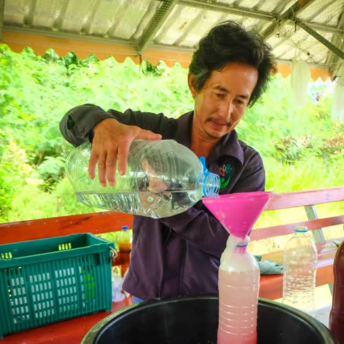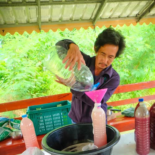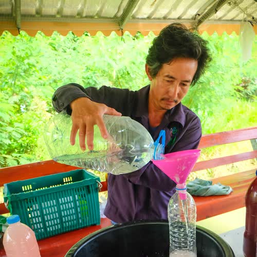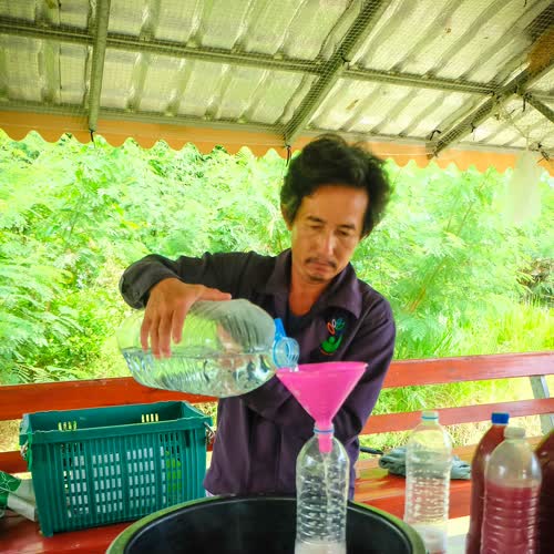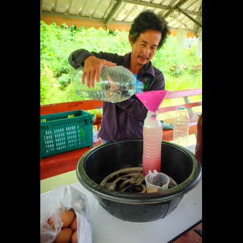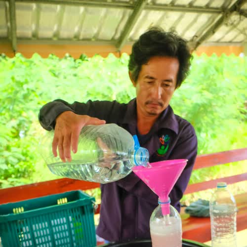 | คำอธิบาย : แล้วค่อยๆ เติมน้ำให้หมดฟอง (ให้ล้นเลย) เป็นการขจัดอ๊อกซิเจนให้ออกมา จุลินทรีย์สังเคราะห์แสงไม่ต้องการอากาศ เมื่อไม่มีอากาศจุลินทรีย์ตัวอื่นก็อยู่ไม่ได้ |