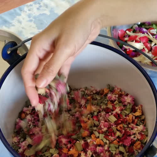 "บุหงาดอกไม้แห้ง ขั้นที่ 1 นำดอกไม้หอมหลากสีสรรมาคละเคล้าผสมกัน".