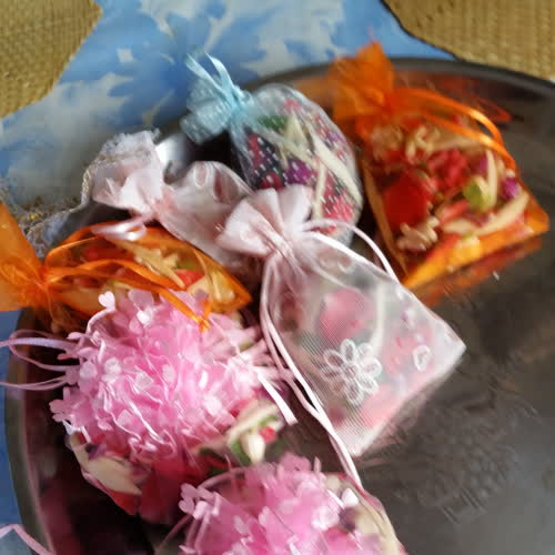 รีวิว : บุหงาดอกไม้แห้ง ขั้นที่ 3 นำบุหงาบรรจุใส่ถุงผ้าโปร่ง