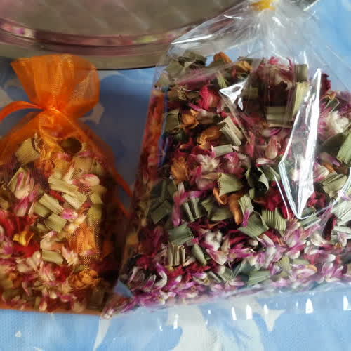 บุหงาดอกไม้แห้ง ขั้นที่ 3 นำบุหงาบรรจุใส่ถุงผ้าโปร่ง