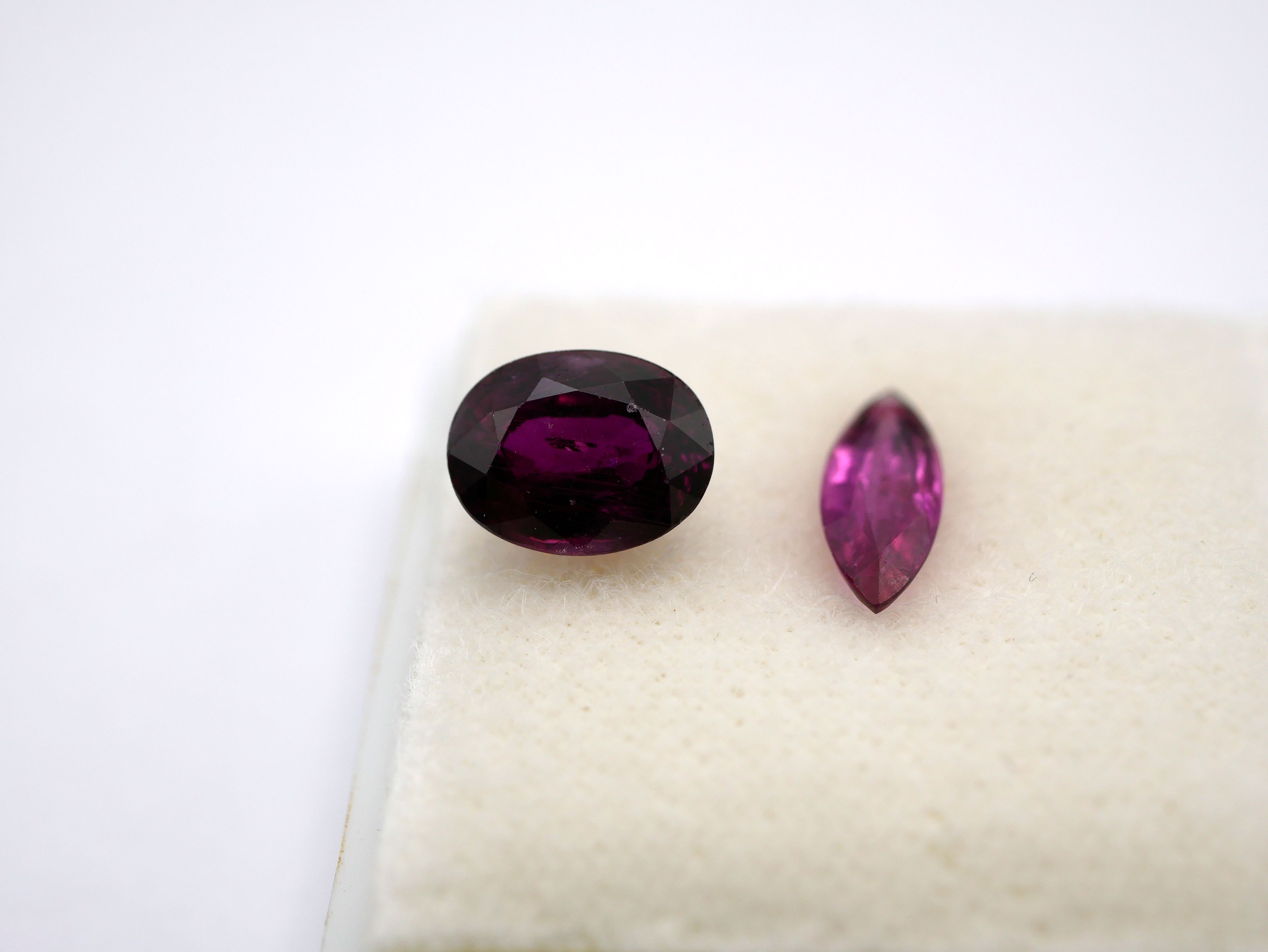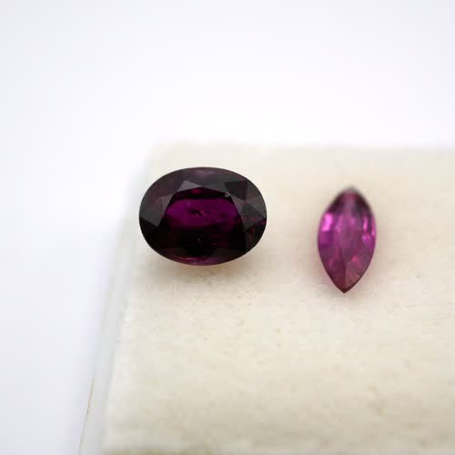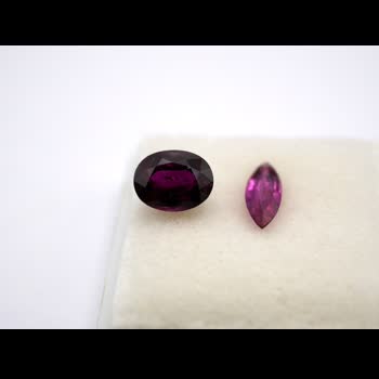 | คำอธิบาย : ทับทิมสยาม สีแดงอมสีม่วง (ออกสีม่วง) จากนาวง จังหวัดจันทบุรี มีลักษณะพิเศษ คือ สีมีแดงอมสีม่วง (เด่นสีม่วง) ต่างจากทับทิมสยามจากบ่ออื่นๆ ในจังหวัดจันทบุรี ซึ่งจะมีสีอื่น เช่น สีแดงดำ สีแดงเลือดนก สีชมพู สีส้ม สีแดงอมสีน้ำเงินและสีม่วง เป็นต้น ทับทิมสยามที่มีสีเข้มจะมีราคาสูงกว่าสีอ่อน (จากภาพด้านขวามือ คือ ทับทิมสยามสีแดงอมม่วงเข้ม รูปทรงไข่ ด้านซ้ายมือ คือ ทับทิมสยามสีแดงอมม่วงอ่อน รูปทรงมาร์คีส หรือ ทรงเม็ดข้าวสาร) |