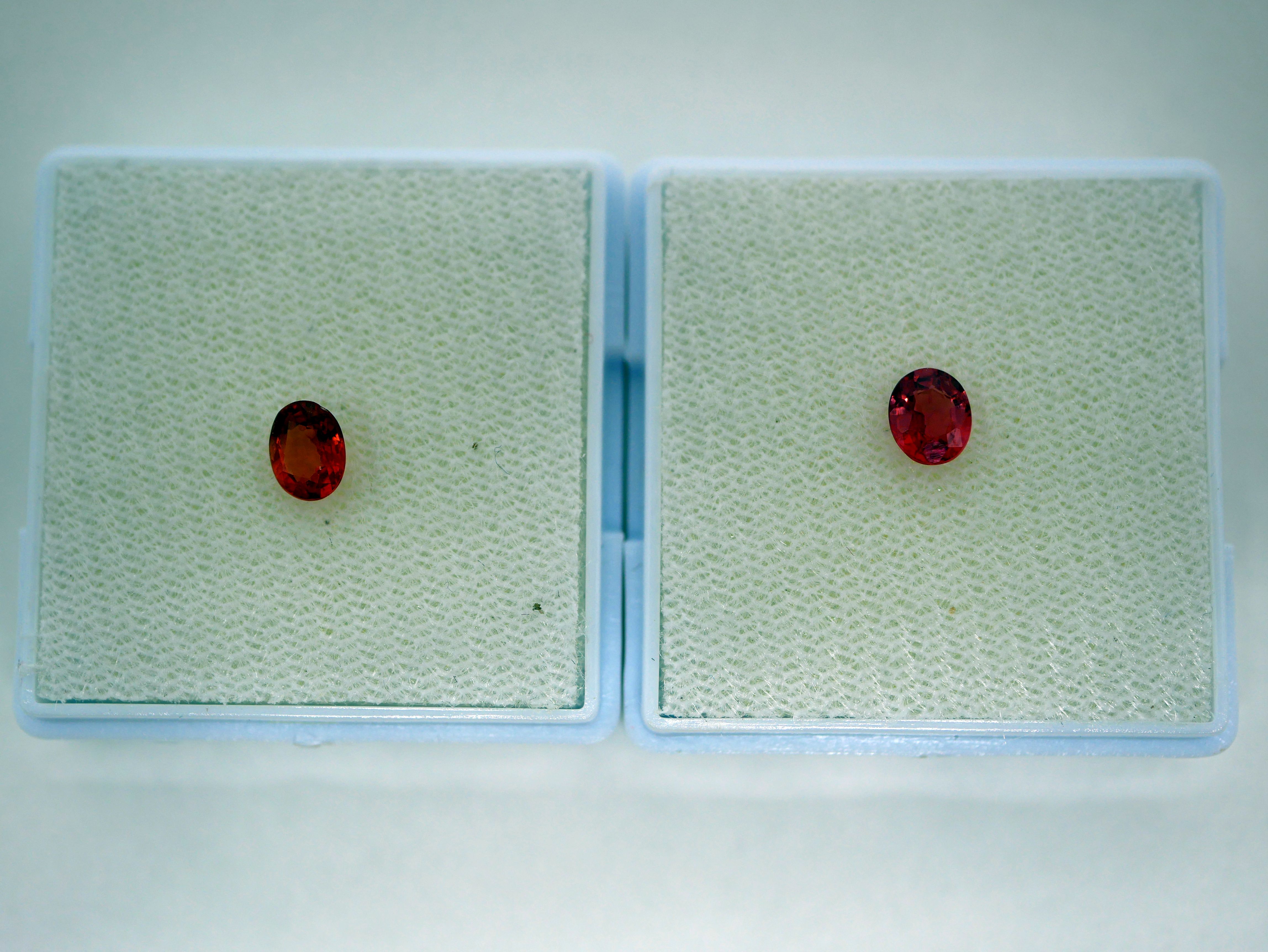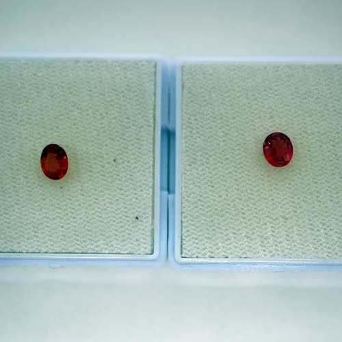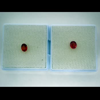 | คำอธิบาย : ทับทิมสยาม สีส้มอมสีชมพู (เด่นสีส้ม) จากบ่อตกพรม ตำบลตกพรม อำเภอขลุง จังหวัดจันทบุรี มีลักษณะพิเศษ คือ สีส้มอมชมพู (เด่นสีส้ม) สีส้ม หรือสีชมพูอมม่วง ต่างจากทับทิมสยามจากบ่ออื่นๆ ในจังหวัดจันทบุรี ซึ่งจะมีสีอื่น เช่น สีแดงดำ สีแดงเลือดนก สีแดงอมสีน้ำเงินและสีม่วง สีแดงอมสีม่วง เป็นต้น ทับทิมสยามที่มีสีเข้มจะมีราคาสูงกว่าสีอ่อน (จากภาพด้านขวามือ คือ ทับทิมสยามสีส้มอมสีชมพูอ่อน รูปทรงไข่ ด้านซ้ายมือ คือ ทับทิมสยามสีส้มอมสีชมพูเข้ม รูปทรงไข่) |