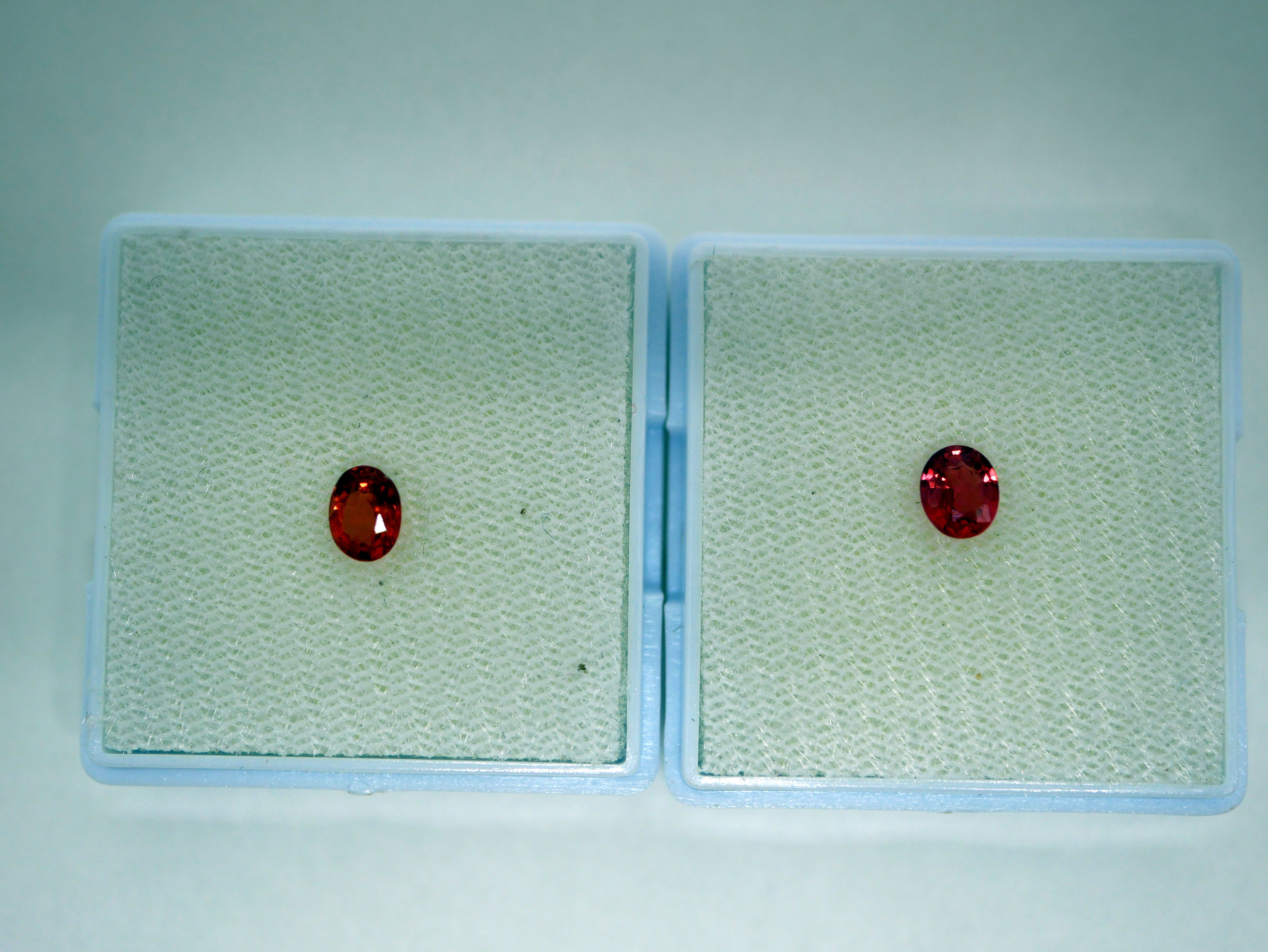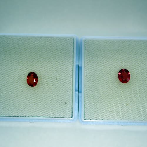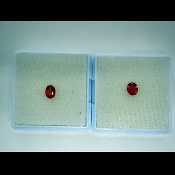| คำอธิบาย : ทับทิมสยาม สีส้มอมสีชมพู (เด่นสีส้ม) จากบ่อตกพรม ตำบลตกพรม อำเภอขลุง จังหวัดจันทบุรี มีลักษณะพิเศษ คือ สีส้มอมชมพู (เด่นสีส้ม) สีส้ม หรือสีชมพูอมม่วง ต่างจากทับทิมสยามจากบ่ออื่นๆ ในจังหวัดจันทบุรี ซึ่งจะมีสีอื่น เช่น สีแดงดำ สีแดงเลือดนก สีแดงอมสีน้ำเงินและสีม่วง สีแดงอมสีม่วง เป็นต้น ทับทิมสยามที่มีสีเข้มจะมีราคาสูงกว่าสีอ่อน (จากภาพด้านขวามือ คือ ทับทิมสยามสีส้มอมสีชมพูอ่อน รูปทรงไข่ ด้านซ้ายมือ คือ ทับทิมสยามสีส้มอมสีชมพูเข้ม รูปทรงไข่) |