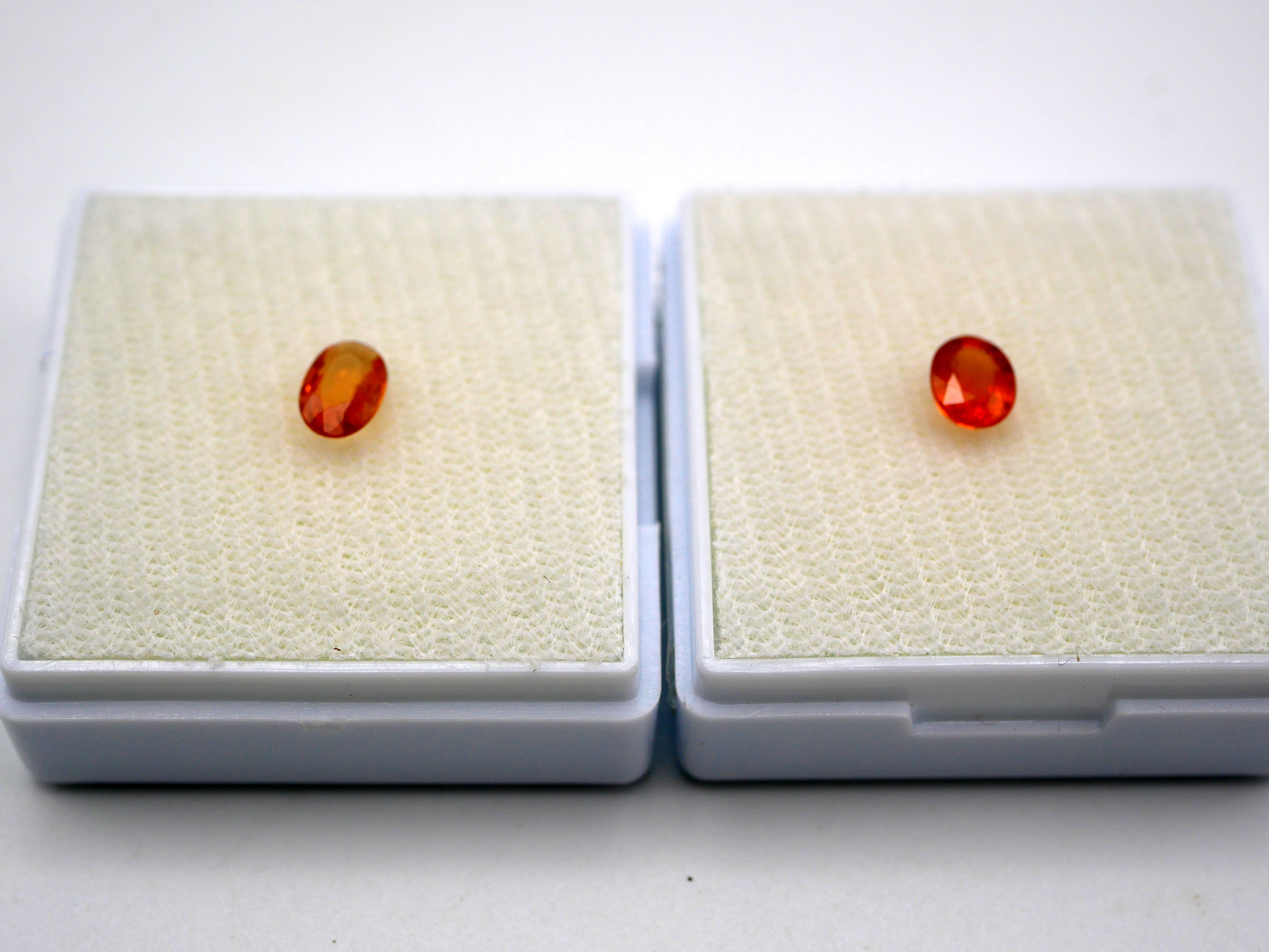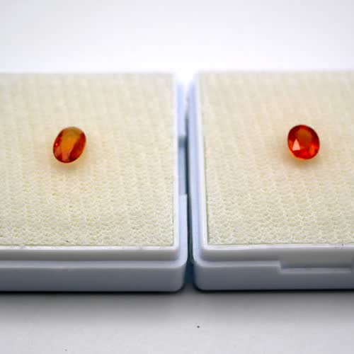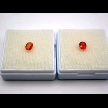 | คำอธิบาย : ทับทิมสยาม สีสีม (Orange sapphire) จากบ่อตกพรม ตำบลตกพรม อำเภอขลุง จังหวัดจันทบุรี มีลักษณะพิเศษ คือ สีส้ม สีส้มอมสีชมพู หรือ สีชมพูอมสีม่วง ต่างจากทับทิมสยามจากบ่ออื่นๆ ในจังหวัดจันทบุรี ซึ่งจะมีสีอื่น เช่น สีแดงดำ สีแดงเลือดนก สีแดงอมสีน้ำเงินและสีม่วง สีแดงอมสีม่วง เป็นต้น ทับทิมสยามที่มีสีเข้มจะมีราคาสูงกว่าสีอ่อน (จากภาพด้านขวามือ คือ ทับทิมสยามสีส้มเข้ม รูปทรงไข่ ด้านซ้ายมือ คือ ทับทิมสยามสีส้มอ่อน รูปทรงไข่) |