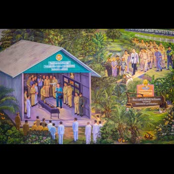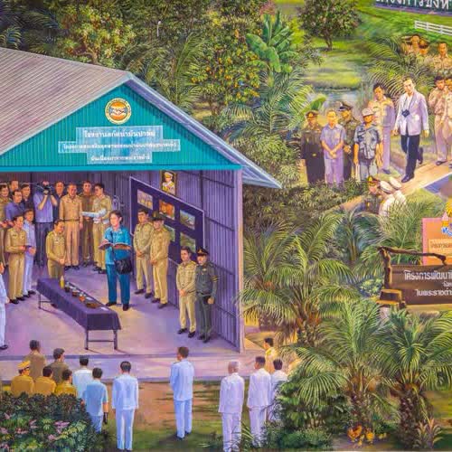 | คำอธิบาย : ภาพจิตรกรรมโครงการอันเนื่องมาจากพระราชดำริ ตำแหน่งที่ ๑ (บริเวณผนังกึ่งกลางพระที่นั่งทรงธรรม) ประกอบด้วยโครงการอันเนื่องมาจากพระราชดำริ ในพื้นที่โครงการส่วนพระองค์สวนจิตรลดา และพื้นที่กรุงเทพมหานครและปริมณฑล ดำเนินการโดยสำนักช่างสิบหมู่ จิตรกรรมโครงการพระราชดำริ ภายในพระที่นั่งทรงธรรม สำนักช่างสิบหมู่ กรมศิลปากร ดำเนินการออกแบบโดย นายมณเฑียร ชูเสือหึง ตำแหน่งจิตรกรเชี่ยวชาญ โดยความร่วมมือกันระหว่างสำนักช่างสิบหมู่ สถาบันบัณฑิตพัฒนศิลป์ สถาบันเทคโนโลยีราชมงคล วิทยาเขตเพาะช่าง ในการดำเนินงานเขียนจิตรกรรมโครงการพระราชดำริ ภายในพระที่นั่งทรงธรรม ประกอบด้วย ส่วนที่ ๑ (บริเวณผนังกึ่งกลางพระที่นั่งทรงธรรม)ประกอบด้วยโครงการอันเนื่องมาจากพระราชดำริ ในพื้นที่โครงการส่วนพระองค์สวนจิตรลดา และพื้นที่กรุงเทพมหานครและปริมณฑล ส่วนที่ ๒ บริเวณด้านทิศใต้ของอาคารพระที่นั่งทรงธรรม ประกอบด้วยโครงการอันเนื่องมาจากพระราชดำริ ในพื้นที่ภาคใต้และพื้นที่ภาคกลาง ส่นที่ ๓ บริเวณด้านทิศเหนือของอาคารพระที่นั่งทรงธรรมประกอบด้วยโครงการอันเนื่องมาจากพระราชดำริ ในพื้นที่ภาคเหนือ และพื้นที่ภาคตะวันออกเฉียงเหนือ |