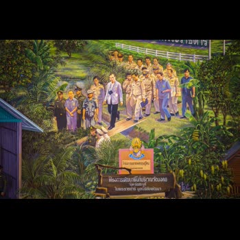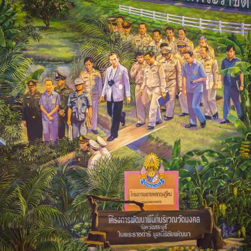 | คำอธิบาย : ภาพจิตรกรรมโครงการอันเนื่องมาจากพระราชดำริ ตำแหน่งที่ ๑ (บริเวณผนังกึ่งกลางพระที่นั่งทรงธรรม) ประกอบด้วยโครงการอันเนื่องมาจากพระราชดำริ ในพื้นที่โครงการส่วนพระองค์สวนจิตรลดา และพื้นที่กรุงเทพมหานครและปริมณฑล ดำเนินการโดยสำนักช่างสิบหมู่ จิตรกรรมโครงการพระราชดำริ ภายในพระที่นั่งทรงธรรม สำนักช่างสิบหมู่ กรมศิลปากร ดำเนินการออกแบบโดย นายมณเฑียร ชูเสือหึง ตำแหน่งจิตรกรเชี่ยวชาญ โดยความร่วมมือกันระหว่างสำนักช่างสิบหมู่ สถาบันบัณฑิตพัฒนศิลป์ สถาบันเทคโนโลยีราชมงคล วิทยาเขตเพาะช่าง ในการดำเนินงานเขียนจิตรกรรมโครงการพระราชดำริ ภายในพระที่นั่งทรงธรรม ประกอบด้วย ส่วนที่ ๑ (บริเวณผนังกึ่งกลางพระที่นั่งทรงธรรม)ประกอบด้วยโครงการอันเนื่องมาจากพระราชดำริ ในพื้นที่โครงการส่วนพระองค์สวนจิตรลดา และพื้นที่กรุงเทพมหานครและปริมณฑล ส่วนที่ ๒ บริเวณด้านทิศใต้ของอาคารพระที่นั่งทรงธรรม ประกอบด้วยโครงการอันเนื่องมาจากพระราชดำริ ในพื้นที่ภาคใต้และพื้นที่ภาคกลาง ส่นที่ ๓ บริเวณด้านทิศเหนือของอาคารพระที่นั่งทรงธรรมประกอบด้วยโครงการอันเนื่องมาจากพระราชดำริ ในพื้นที่ภาคเหนือ และพื้นที่ภาคตะวันออกเฉียงเหนือ |