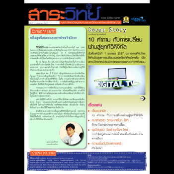 | คำอธิบาย : สาระวิทย์ฉบับที่ 13/2557 นำเสนอเนื้อหาน่าสนใจ ดังนี้เรื่องจากปก : 10 คำถาม กับการเปลี่ยนผ่านสู่ยุคทีวีดิจิทัลหน้าต่างข่าว วิทย์-เทคโนฯ โลก : รักษาโรคจอประสาทตาเสื่อมระเบียงข่าว วิทย์-เทคโนฯ ไทย : การใช้สบู่ดำและปาล์มน้ำมันเพื่อเป็นพลังงานทางเลือกความเชื่อกับวิทยาศาสตร์ : ศพไม่เน่า |