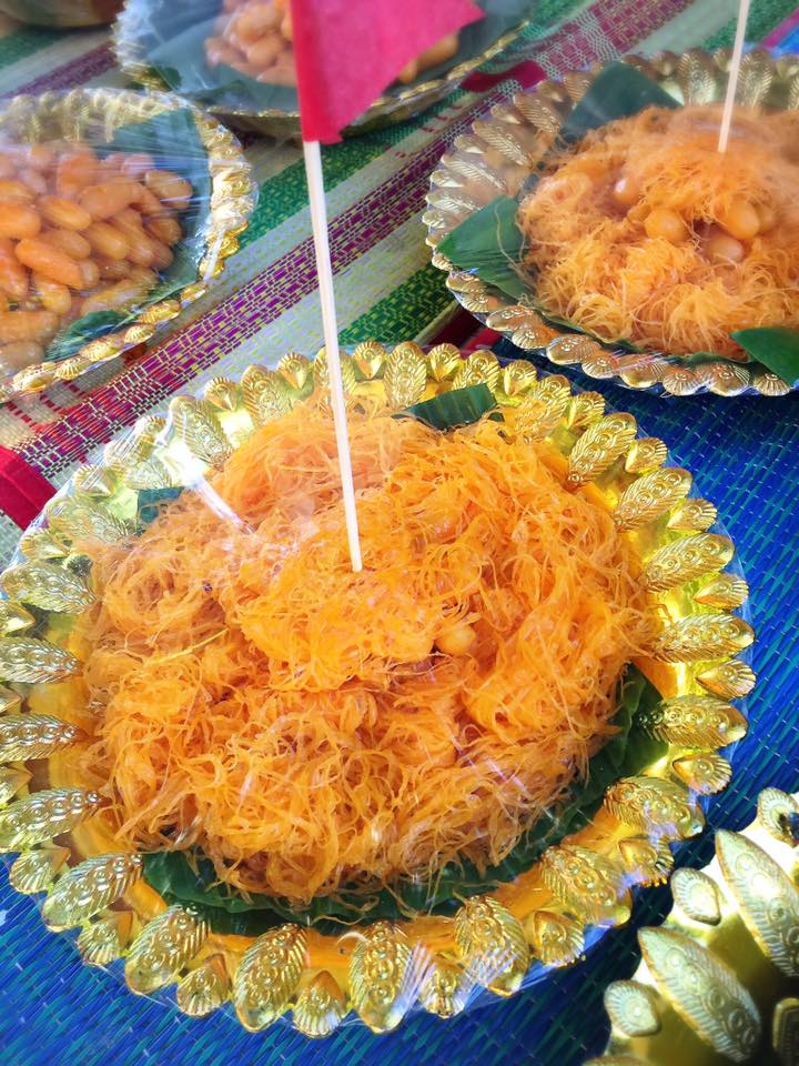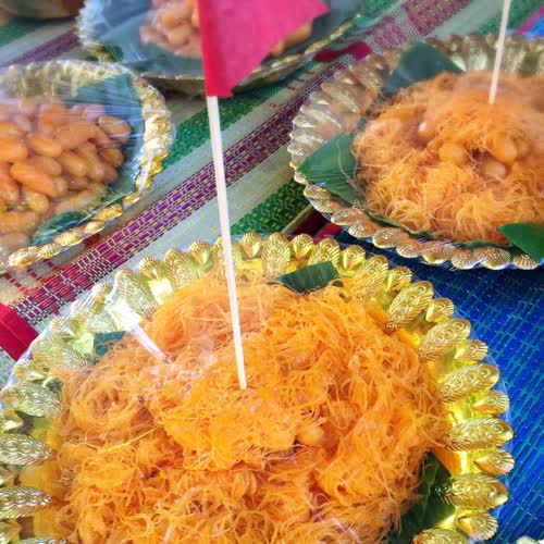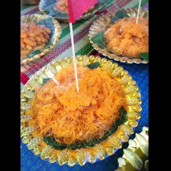 | คำอธิบาย : ขันหมาก ชุดเครื่องพิธี ของขบวนขันหมากฝ่ายเจ้าบ่าว คนเฒ่าคนแก่เล่าว่า คนที่จัดเครื่องขันหมาก เพื่อความเป็นศิริมงคล จะให้ผู้หลักผู้ใหญ่ที่ครองรักกันมานานเป็นผู้จัด หรือผู้ที่ผู้คนให้ความเคารพ เป็นผู้จัด ขันหมากในแต่ละภาคก็จะแตกต่างกันไป จำนวน เครื่องจะทำเป็นคู่ มีเครื่องคาวหวาน ขนม มงคลต่างๆ ผลไม้มงคล |