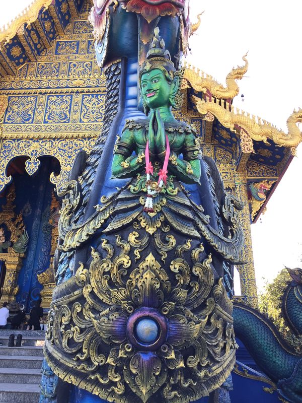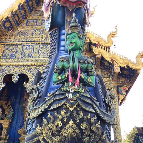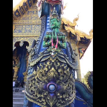 | คำอธิบาย : วัดร่องเสือเต้น จ.เชียงราย สร้างสรรค์ขึ้นด้วยจากฝีมือของศิลปินชาวพื้นบ้าน นายพุทธา กาบแก้ว หรือ สล่านก ศิลปินท้องถิ่นชาวเชียงราย ผู้ซึ่งเมื่อคราวจบการศึกษาใหม่ๆ ได้มีโอกาสเข้าไปศึกษาและเป็นลูกมือของอาจารย์เฉลิมชัย ในการสร้างวัดร่องขุน เมื่อมีโอกาสได้มาสร้างวิหารวัดแห่งนี้ จึงได้นำวิชาที่ร่ำเรียนมารังสรรค์ให้เกิดประโยชน์ จนกลายเป็นวัดโดดเด่นในเรื่องสีสันและความสวยงาม |