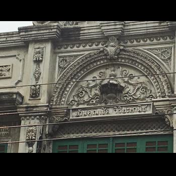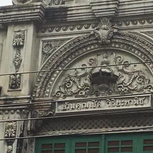 | คำอธิบาย : อาคารเก่าสภาพสมบูรณ์ บนถนนพระสุเมรุ มีป้ายข้อความประกอบลวดลายระบุชื่อเจ้าของอาคาร “บ้านของคุณเชิด วิริยะพานิช” |