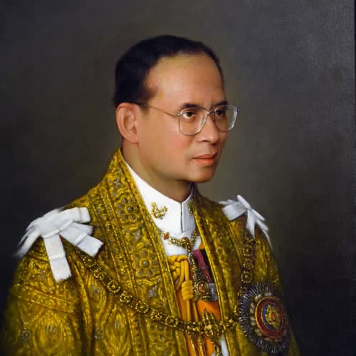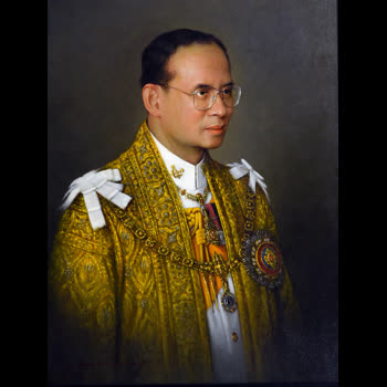 | คำอธิบาย : พระบรมสาทิสลักษณ์ พระบาทสมเด็จพระปรมินทรมหาภูมิพลอดุลยเดช ด้วยเทคนิค สีน้ำมันบนผ้าใบ |