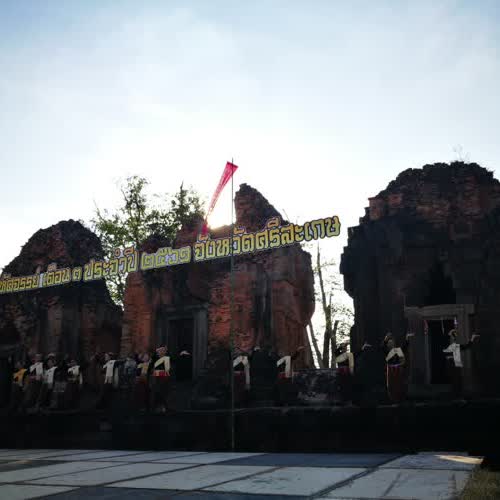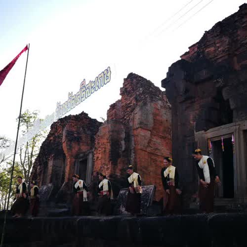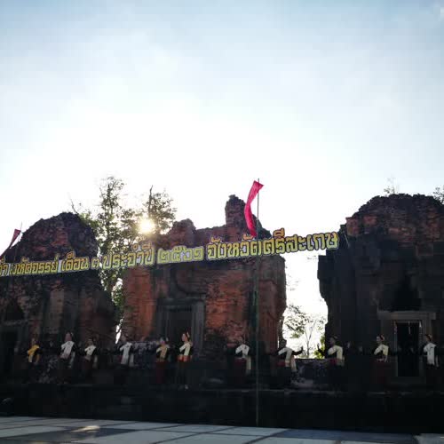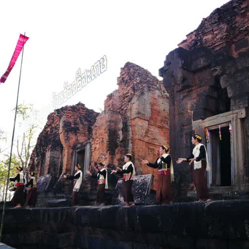 | คำอธิบาย : การแสดงรำในการแถลงข่าวงานหวัวบุญเบิกฟ้า ขึ้น 3 ค่ำ เดือน 3 เมื่อวันที่ 17 ม.ค. 2561 ที่ปราสาทปรางค์กู่ จ.ศรีสะเกษ |