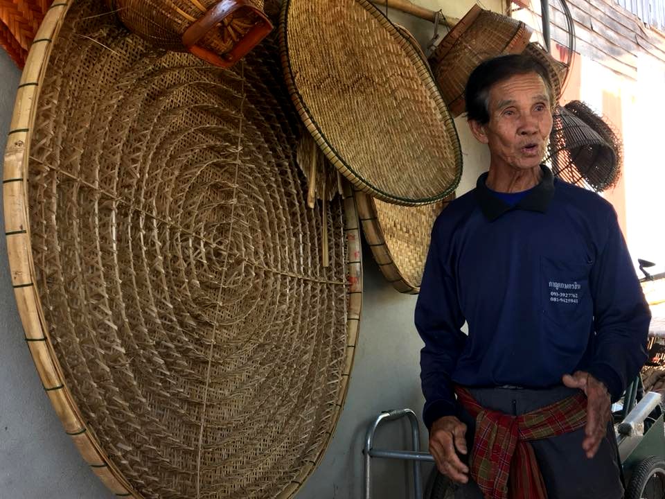 | คำอธิบาย : ชุมชนชาวกูยบ้านกู่ อ.ปรางค์กู่ จ.ศรีสะเกษ นอกจากจะทำนาปลูกข้าว ยังมีการเลี้ยงไหมทอผ้า รวมถึงมีการจัดตั้งกลุ่มจักสาน เช่น สานตะกร้า และสานกระด้งเลี้ยงไหม หรือ จ่อ เพื่อใช้ในครัวเรือนและเพื่อจำหน่ายสร้างรายได้ กระด้งเลี้ยงไหม หรือ จ่อ มีรูปร่างทรงกลม ประกอบด้วยวงเล็กๆ ขดจากข้างในออกไปยังข้างนอก เพื่อให้ไหมได้เกาะสร้างรังไหม ในภาพ ชาวกูยบ้านกู่ กำลังอธิบายลักษณะของกระด้งเลี้ยงไหมและการสานกระด้งเลี้ยงไหม |