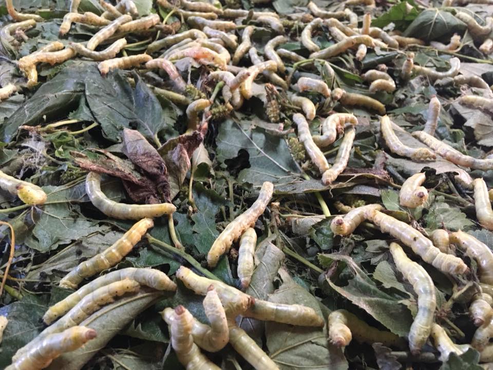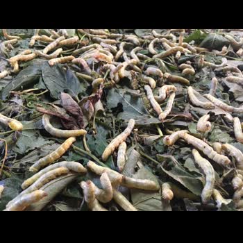 | คำอธิบาย : ชุมชนชาวกูยบ้านกู่ อ.ปรางค์กู่ จ.ศรีสะเกษ นอกจากจะทำนาปลูกข้าว ยังมีการเลี้ยงไหมทอผ้า ในภาพคือไหมวัยใกล้สุก (กินใบหม่อนเต็มที่ พร้อมจะพ่นใยสร้างรังไหม) กำลังกินใบหม่อน |