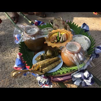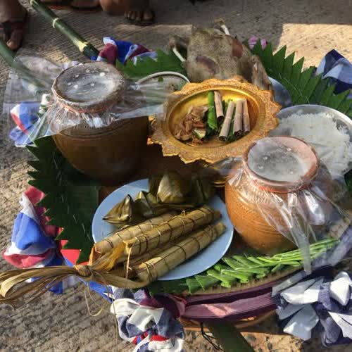 | คำอธิบาย : เครื่องเซ่นไหว้เพื่อกระทำพิธีสักการะพ่อปู่พัทธเสน และบวงสรวงเซ่นไหว้บรรพบุรุษกูย ณ ปราสาทปรางค์กู่ ในงานหวัวบุญเบิกฟ้า ขึ้น 3 ค่ำ มหัศจรรย์เดือน 3 อ.ปรางค์กู่ จ.ศรีสะเกษ |