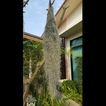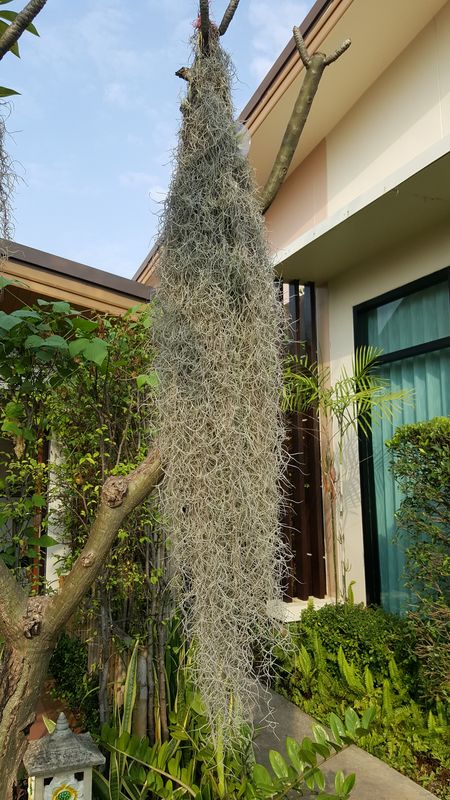 | คำอธิบาย : เคราฤษี หรือ มอสสเปน เป็นพืชในวงศ์สับปะรดที่ไม่มีราก ต้นห้อยย้อยลงมาจากคาคบไม้เป็นสายยาว พบน้อยที่มีรากเส้นเล็กๆ งอกออกมา ดอกกลิ่นหอมอ่อน ๆ ดูดน้ำโดยทางใบสีเทาเงิน เนื่องจากมีไตรโคมสีเงินบนใบ ช่วยให้ดูดน้ำจากอากาศที่ชุ่มชื้นได้ดี |