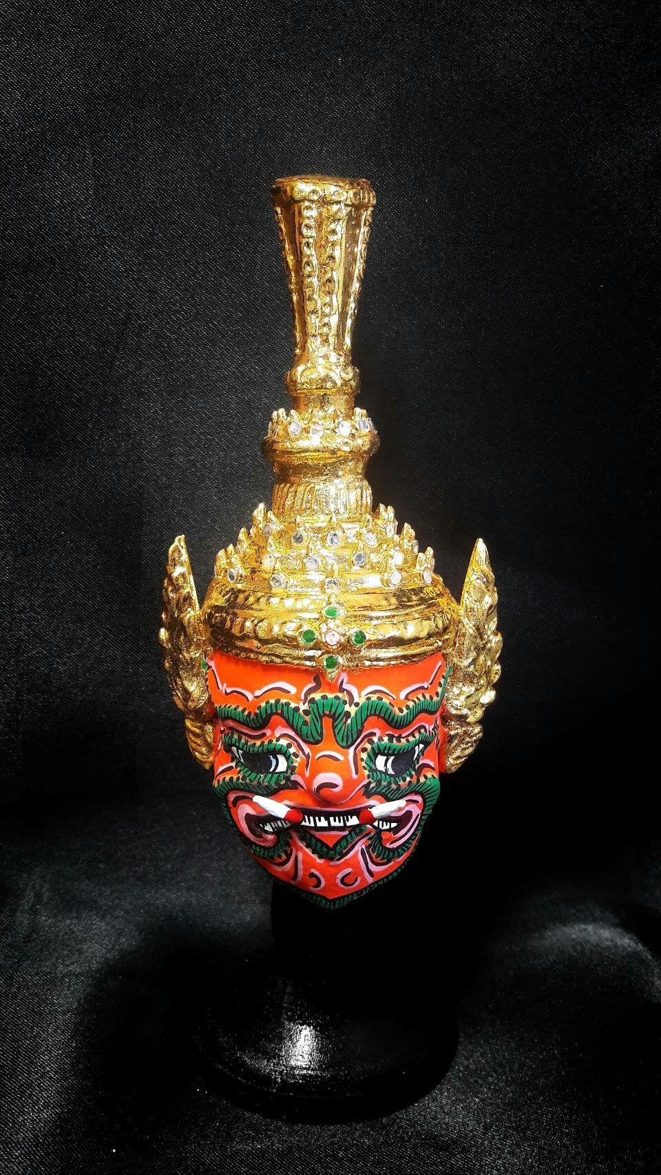 | คำอธิบาย : สัทธาสูร พญายักษ์ เจ้าเมืองอัสดงค์ เป็นสหายทศกัณฐ์ ลักษณะหัวโขน หน้ายักษ์สีหงเสน ปากขบตาจรเข้ ตาโพลง สวมมงกุฏจีบ |