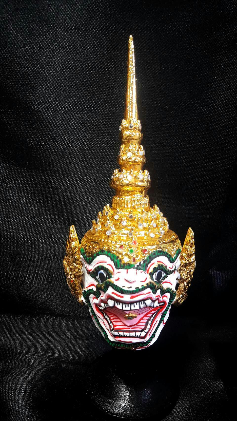 | คำอธิบาย : หนุมานครองเมือง เป็นหัวโขนเศียรวานร ปากอ้ามีเขี้ยวแก้วกลางเพดาน สวมชฏายอดชัย |