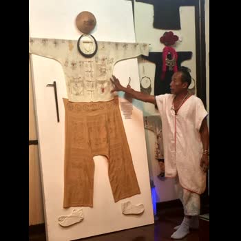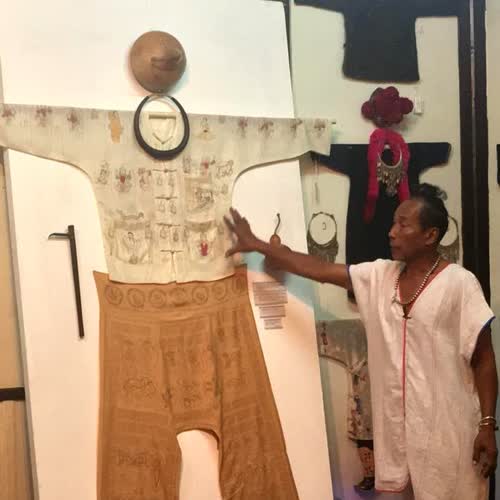 | คำอธิบาย : เสื้อและกางเกงลงยันต์จากรัฐฉาน ประเทศพม่า อายุราว 50-60 ปี คนที่ทำคือพระ วัตถุประสงค์เพื่อเป็นขวัญกำลังใจและคุ้มครองปกป้องรักษาผู้สวมใส่ โดยหน้าอกของเสื้อปรากฏรูปเทวดาต่างๆ ส่วนรอบเอวกางเกงปรากฏนักษัตรทั้ง 12 นักษัตร ขณะที่ด้านหน้าและด้านหลังของกางเกงปรากฏรูปเทวดาต่างๆ อุปกรณ์ที่ใช้วาดคือไม้ไผ่ที่นำมาเหลาให้แหลม แล้วจุ่มน้ำหมึกเพื่อเขียนลาย และใช้พู่กันประกอบเพื่อระบายสี |