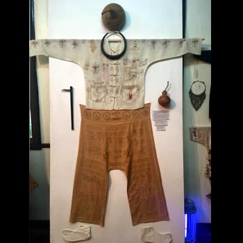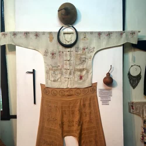 | คำอธิบาย : เสื้อและกางเกงลงยันต์จากรัฐฉาน ประเทศพม่า อายุราว 50-60 ปี คนที่ทำคือพระ วัตถุประสงค์เพื่อเป็นขวัญกำลังใจและคุ้มครองปกป้องรักษาผู้สวมใส่ โดยหน้าอกของเสื้อปรากฏรูปเทวดาต่างๆ ส่วนรอบเอวกางเกงปรากฏนักษัตรทั้ง 12 นักษัตร ขณะที่ด้านหน้าและด้านหลังของกางเกงปรากฏรูปเทวดาต่างๆ อุปกรณ์ที่ใช้วาดคือไม้ไผ่ที่นำมาเหลาให้แหลม แล้วจุ่มน้ำหมึกเพื่อเขียนลาย และใช้พู่กันประกอบเพื่อระบายสี |
