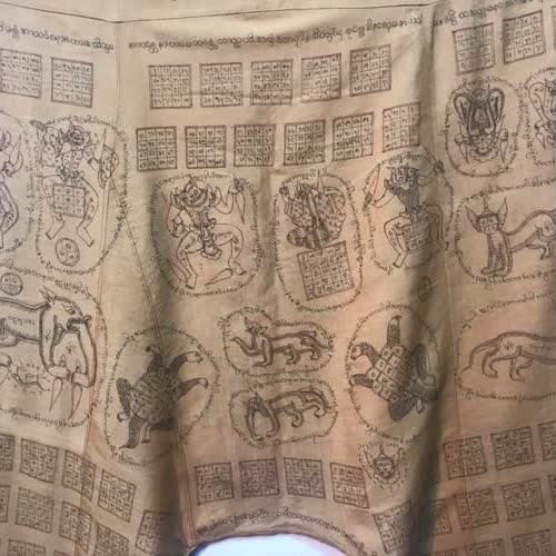 | คำอธิบาย : กางเกงลงยันต์จากรัฐฉาน ประเทศพม่า อายุราว 50-60 ปี คนที่ทำคือพระ วัตถุประสงค์เพื่อเป็นขวัญกำลังใจและคุ้มครองปกป้องรักษาผู้สวมใส่ โดยหน้าอกของเสื้อปรากฏรูปเทวดาต่างๆ ส่วนรอบเอวกางเกงปรากฏนักษัตรทั้ง 12 นักษัตร ขณะที่ด้านหน้าและด้านหลังของกางเกงปรากฏรูปเทวดาต่างๆ อุปกรณ์ที่ใช้วาดคือไม้ไผ่ที่นำมาเหลาให้แหลม แล้วจุ่มน้ำหมึกเพื่อเขียนลาย และใช้พู่กันประกอบเพื่อระบายสี |